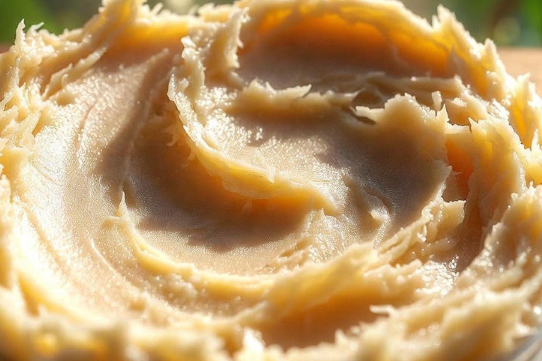 The butter has a smooth, silky texture that melts into your skin and absorbs easily without feeling greasy. It's pale cream colored with a delicious natural vanilla aroma.